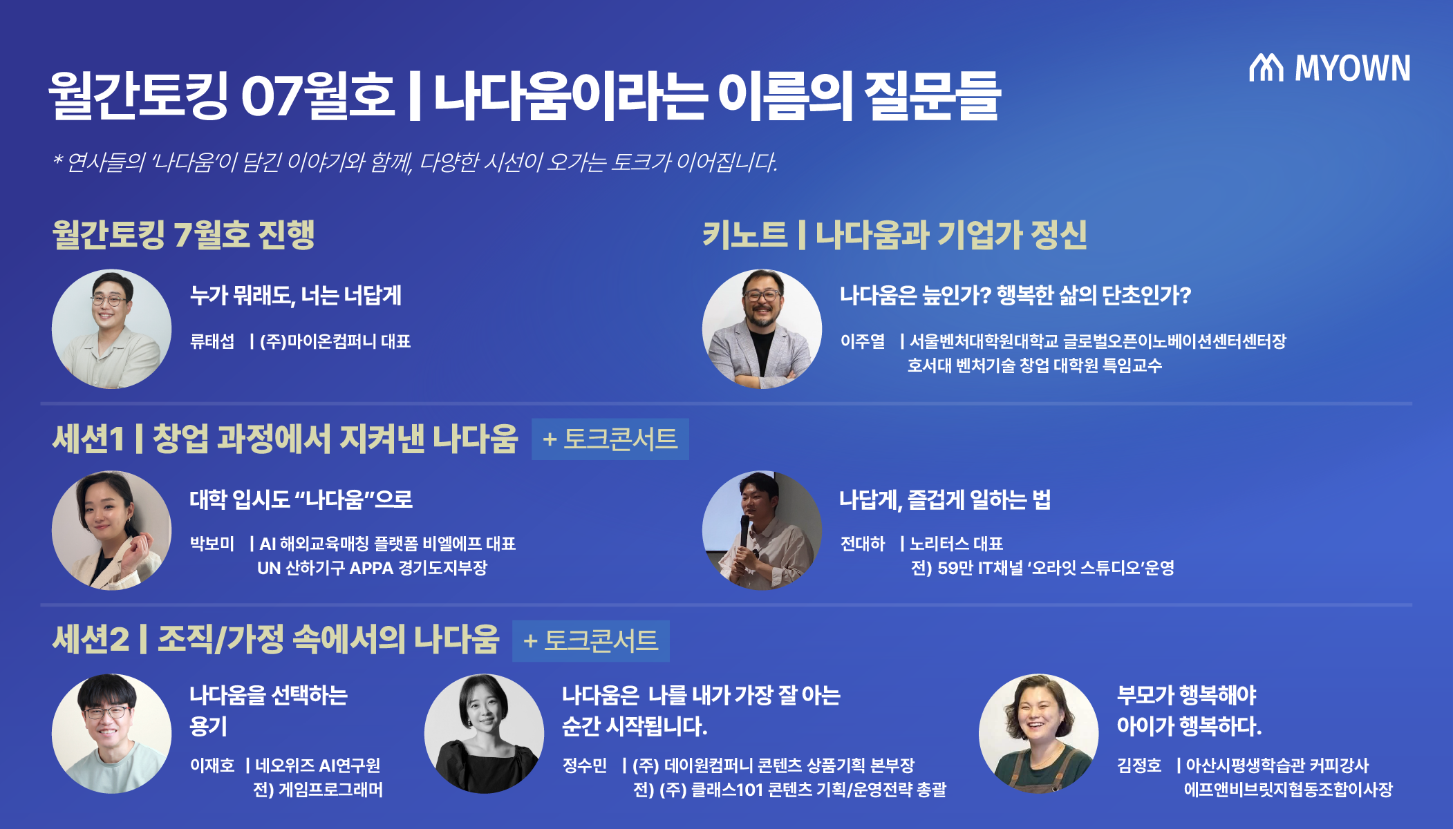 | 20:25~21:25 | 조직/가정 속에서의 나다움(+ 토크콘서트) | 정수민 님 / 이재호 님 / 호야짱 님 |